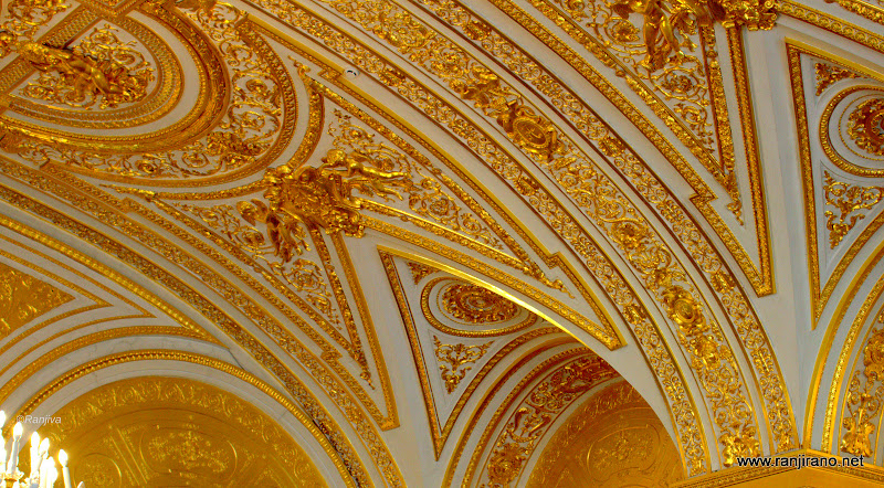 Dans cet ancien palais d'hiver, tout est somptueux mais le regard est surtout attiré par les décors de la salle, des plafonds...